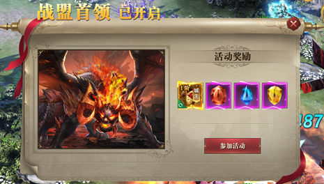 2、玩家战斗抢夺首领归属,归属者可以获得归属奖励,同战盟玩家获得协助奖励,其他玩家获得参与奖励